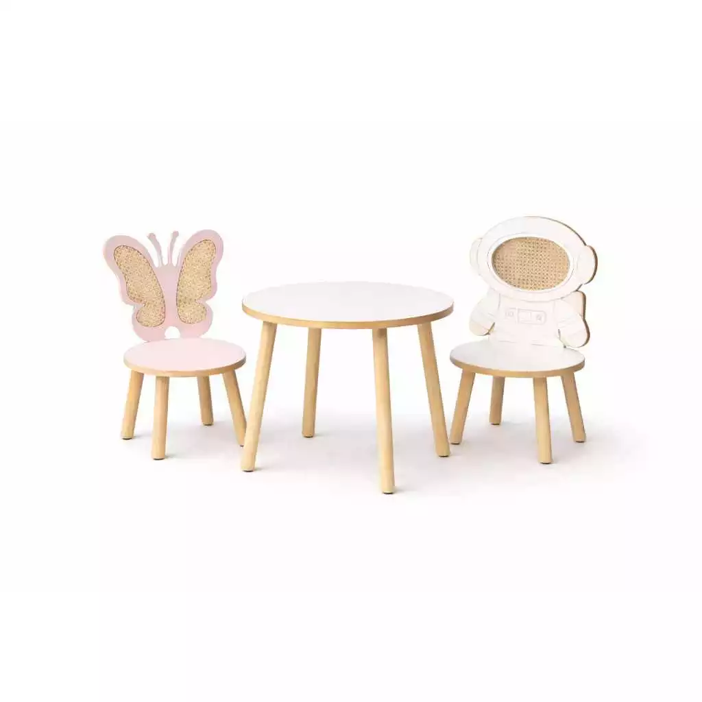 Lindo kit de mesa com 2 cadeiras, sendo uma cadeira modelo borboleta com detalhes no encosto em palha indiana e outra cadeira modelo astronauta com detalhes em palha indiana.
